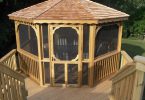 После окончания работ установите ветровую доску, это придаст беседке завершенность. Обработайте древесину морилкой, покройте лаком. Так постройка будет долго сохранять красивый внешний вид. Обязательно выберите подходящий декор беседки.