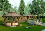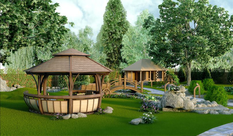 Самый простой, незатейливый вариант зоны для отдыха и в то же время весьма функциональный. В беседке можно посидеть в одиночестве, наслаждаясь книгой за чашкой кофе, можно встретить друзей и провести время за увлекательными играми и разговорами. Беседка может быть сделана из дерева, металла, кирпича и камня, может быть открытой или застекленной, круглой, квадратной или в форме многогранника – такой, как пожелает владелец. Самое важное требование к беседке, как к любому элементу ландшафтного дизайна – соответствие дизайну территории.
