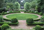 - кустарники в виде геометрических фигур и ровно подстриженный газон;