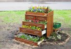 - Вертикальная клумба – отличное решение для цветника на небольшом участке. Цветы высаживаются в многоярусный контейнер, для наполнения которого используются цветущие, вьющиеся плодоносящие растения, пряные травы или зелень.