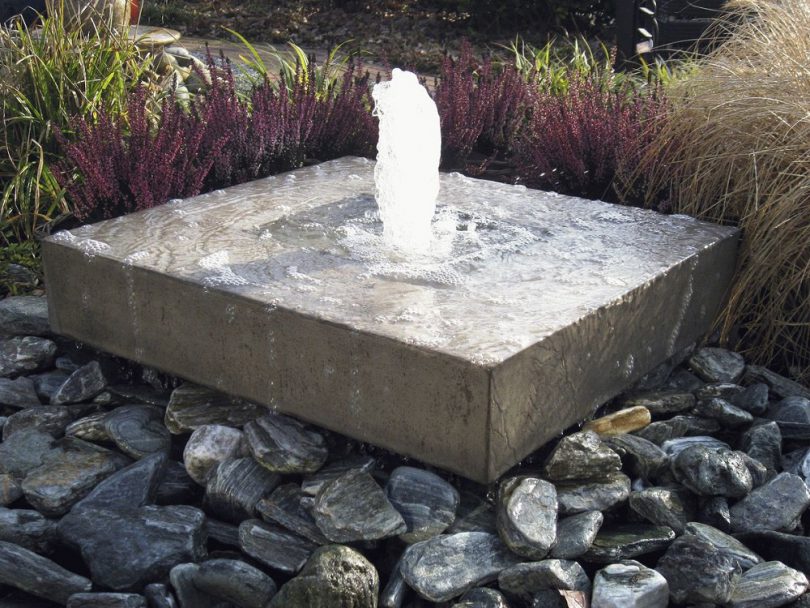 Не имея в наличии погружной насос, можно сделать открытый фонтан. Если у вас на участке имеется скважина с насосом, то можно вывести через трубу эту воду в фонтан. Единственное, нужно будет определиться с местом стока воды – например, можно одновременно включать фонтан и поливать близлежащие растения.