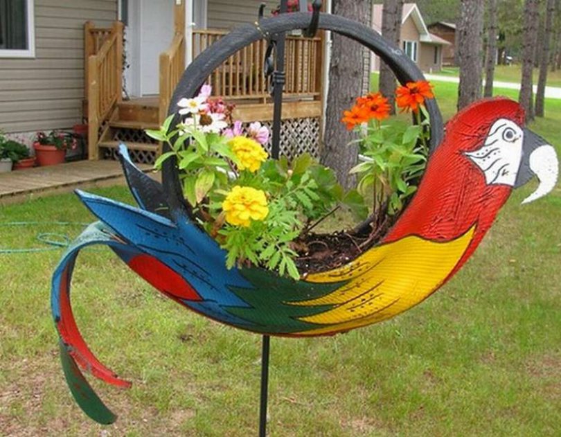 Идеи для дачи и сада могут быть как простыми, так и более сложными. Выше мы рассказывали об известном способе создания клумб из автомобильных шин. Добавить к этому мы бы хотели и то, что колеса (особенно от старых) велосипедов могут послужить прекрасным элементом декора сада.