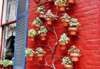 - Классика – цветы. Как традиционный вариант, можно рассмотреть цветы в горшочках, повешенные на забор.