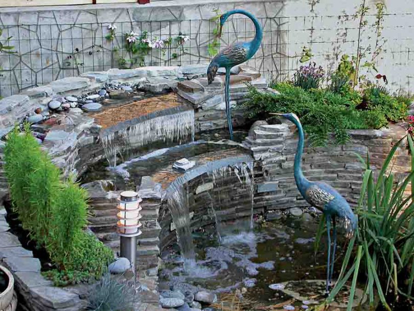 Садовые водопады и фонтаны создаются на основе одних и тех же принципов. Начать следует с рытья котлована, затем необходимо произвести работы по гидроизоляции и водоотводу, и только в конце вы установите водопад. Вы можете купить форму для него в специальном магазине, но есть возможность сделать самостоятельно водопад «каскадный». Для него понадобится большое количество натурального камня, лучше песчаника. В любом случае, фонтан или водопад должны располагаться непосредственно около пруда.