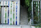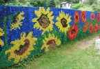 - Панно из крышек от бутылок. Надеюсь, когда вы использовали бутылки для украшения ландшафта, вы не выбросили крышечки? Если нет, смело собирайте их в одну кучу, сортируйте по цвету и приклеивайте на забор в виде узоров. Вы можете выложить цветы, животных или орнаменты, ограничений нет. Это уже более сложные идеи для дачи, фото смотрите ниже.