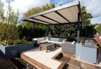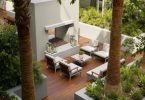Обязательная деталь патио – мебель для отдыха. Во внутреннем дворике можно разместить стол, стулья или кресла из металла, пластика, дерева, ротанга. Кресла и диваны с подушками, а также деревянную мебель без специальной пропитки можно ставить только под водонепроницаемый навес. Дополнить обстановку стоит гамаком, подвесным креслом, уютными качелями. Тут же можно установить переносной мангал, стационарную печь, электрический или угольный гриль, тандыр и другие приспособления для приготовления еды на открытом воздухе. Зону отдыха желательно защитить от солнца маркизой, складным тентом или большим зонтом.