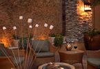 Патио необходимо украсить. Популярный элемент декора – цветы. Их можно высадить по границам зоны отдыха, а также в вазоны и подвесные корзины на кронштейнах. Выбор растений зависит от общего стиля. Например, патио на даче, выдержанное в минималистическом японском духе, можно украсить цветущими ирисами, бамбуком, карликовыми деревьями, разноцветными хризантемами в кадках. Классический европейский дворик оформляется цветущими летниками: бархатцами, настурцией, петуньей, анютиными глазками.