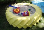 Это самый легкий и быстрый способ сделать песочницу для детей на дачу. Скат от трактора или какой-то другой машины, укладывается в определенном месте, засыпается песком и готово. Можно еще и покрасить. Но такая конструкция подойдет только для маленьких детей. Если на даче залежались колеса от легкового автомобиля, их тоже можно использовать как ограждение для песка.