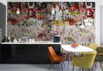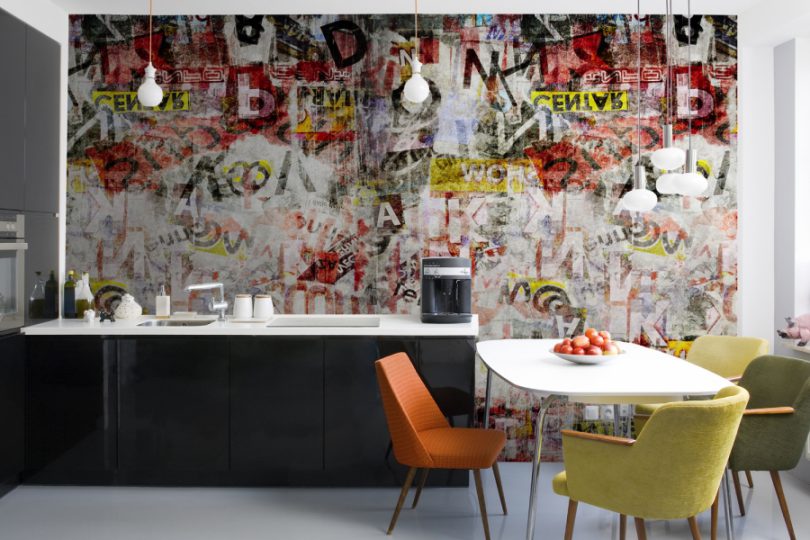Эта комната отличается повышенной влажности, поэтому дешевые бумажные фотообои покупать не следует. На влагостойких обоях должен быть знак в виде 3 волнистых черточек. Хорошо смотрятся продукты питания, овощи, фрукты, иногда возможны яркие расцветки. Также подойдут природные мотивы, урбанистическая тема, цветы, фальш-окно.