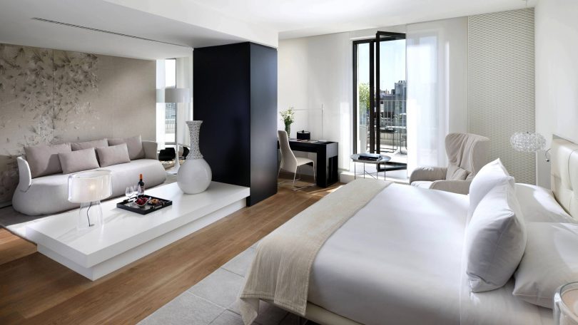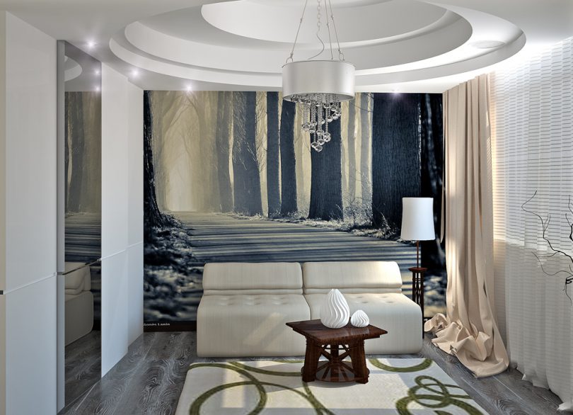 Интересный прием изменения пространства – фотообои на две совмещенные стены. Светлые тона углубят и расширят объем. К оригинальным способам относится и поклейка фотообоев на потолок. Например, пейзаж неба подойдет к стилям хай-тек и модерн.