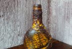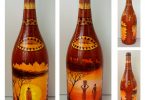 Прикрепить рисовую бумагу к поверхности бутылки одним из двух способов. В первом способе отрывки накладываются на стекло и пропитываются клеем с последующим нанесением лака. Во втором – расположенные на стекле части бумаги смачиваются водой, просушиваются (процесс можно ускорить феном) и затем обрабатываются акриловым лаком.