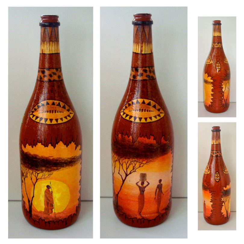 Декупаж бутылок салфетками, фото которых представлены на странице, включает следующие этапы: