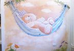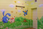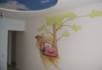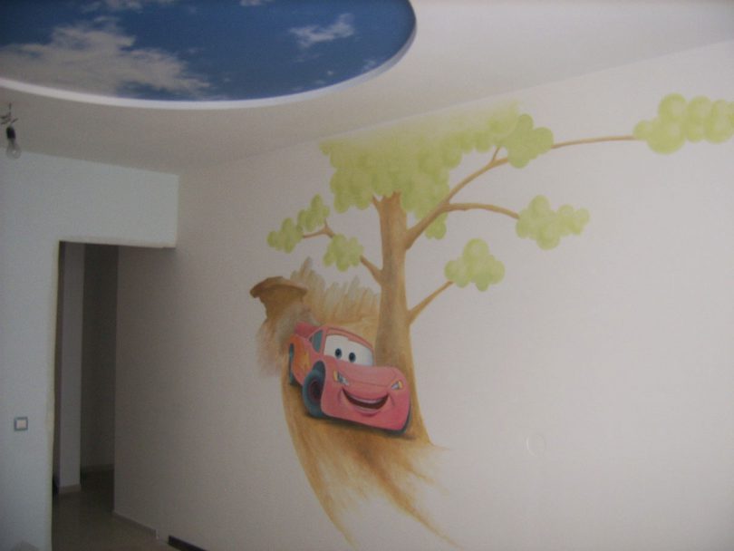 Для создания сюжетных рисунков потребуется очень много времени, опыта и места в комнате. Такое масштабное изображение лучше смотрится в детской, ведь для ребенка можно изобразить интересную сказку. Учитывая сложность работы, лучше ее рисовать с помощью проектора.