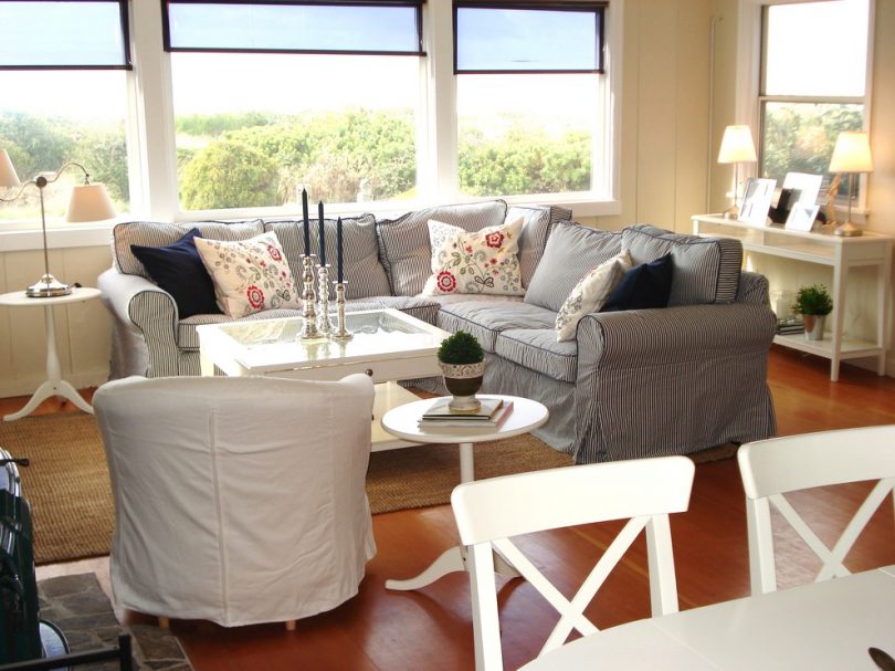 Не бойтесь сделать чехол на диван более свободным, так как его целью является защита от загрязнений и изменение внешнего вида, а не просто перетяг существующей тканевой обивки мебели.