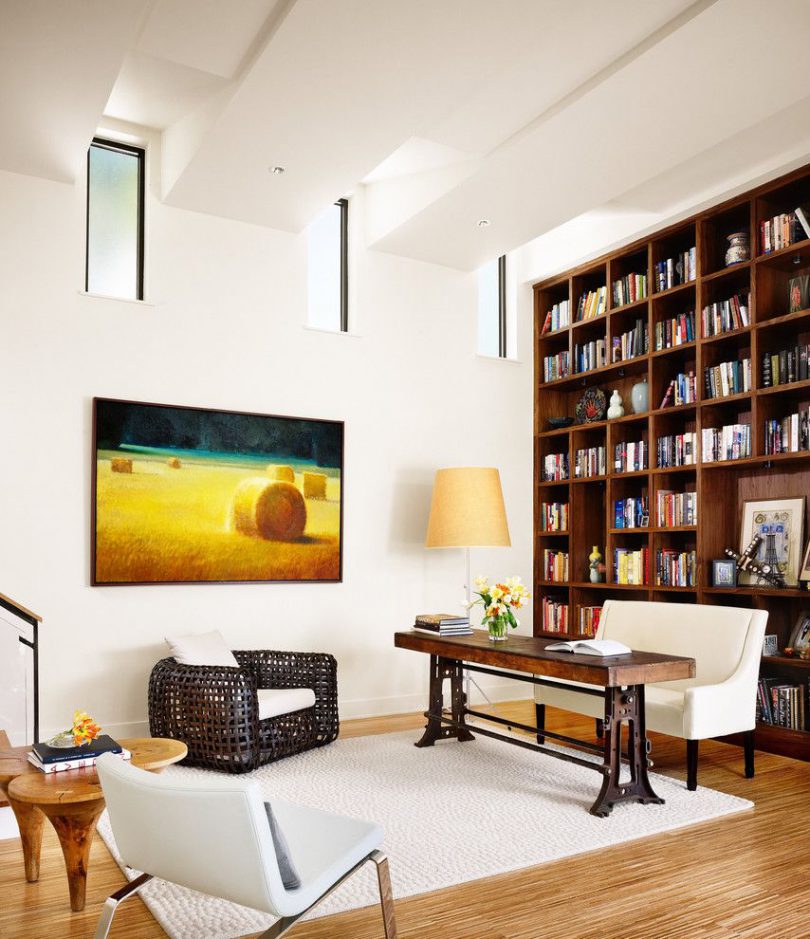 Комнату с достаточным количеством свободного места можно и вовсе использовать, чтобы создать мини галерею и организовывать для себя и семьи небольшие модные выставки. Необходимо приобрести достаточное количество гравюр, небольших живописных полотен или их репродукций, объединенных одним стилем, и вдоль стены под самым потолком прикрепить штангу с крючками. Картины необходимо развесить одну под другой с помощью лески из нейлона. Подобная композиция выгодна своей подвижностью, ее можно постоянно менять, обогащать новыми элементами. Главное, чтобы края постановки образовывали ровные симметричные линии.