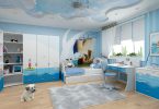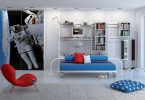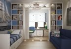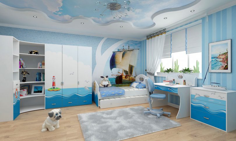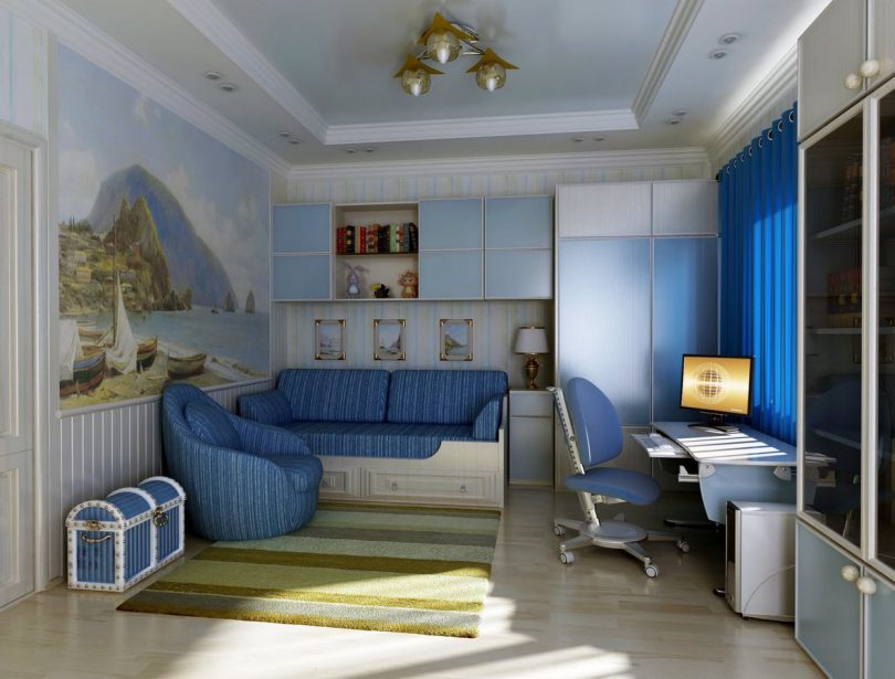 Стильное решение для юных искателей приключений. Несмотря на то, что основным цветом в этой тематике будет холодный синий, у ребенка в любую погоду будет теплое море, острова, чайки над головой. Синий цвет можно разбавить нейтральным белым и яркими красными деталями. Морские карты, якорь, спасательный круг, часы в виде штурвала, модели кораблей, игрушки в виде морских обитателей и большой сундук с «сокровищами» придадут нужный антураж.