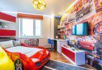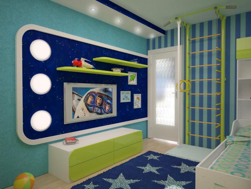Многие ребята без ума от всевозможной техники от паровозов до космических кораблей, такого мальчика порадует комната с технической тематикой. Основным акцентом в такой комнате будут модели техники. Почетное место можно выделить для самодельных экспонатов, поощрив тем самым творческие начинания юного конструктора. Подходящим цветовым решением будут сдержанные тона комнаты, разбавленные несколькими яркими акцентами. Плакаты, чертежи и рисунки украсят стену и оживят интерьер.