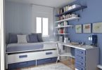 - Спальное место. Выбирая кровать в детскую комнату для мальчика, обратите внимание на модели с подъемным механизмом – вместительное место хранения под кроватью позволит освободить дополнительное пространство. Особое внимание уделите выбору удобного и подходящего по возрасту матраса. Для ребят старше шести лет отличным решением будет кровать-чердак, под которой органично расположится рабочее место. Можно и вовсе заменить кровать многофункциональным угловым диваном, что особенно удобно, если у мальчика часто бывают гости.