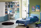 - Рабочая зона. Стол и стул для детской должны соответствовать возрасту ребенка. Покупать такую мебель «на вырост» не самая лучшая идея, так как сегодня малышу может быть некомфортно. Компромиссным вариантом может послужить стол с регулируемой высотой и наклоном столешницы в комплекте с аналогичным стулом, такая мебель будет «расти» вместе с ребенком. Место для рабочего стола должно быть хорошо освещенным в любое время дня, отлично подойдет пространство у окна. Расположите стол так, чтобы ребенок не загораживал себе свет. Совсем не обязательно устанавливать корпусный шкаф в детскую комнату для мальчика, разумней будет заменить его встроенным, так же на помощь придут различные ящики, полки. Мебель в детскую комнату для мальчика должна быть функциональной и вместительной, но при этом не громоздкой.