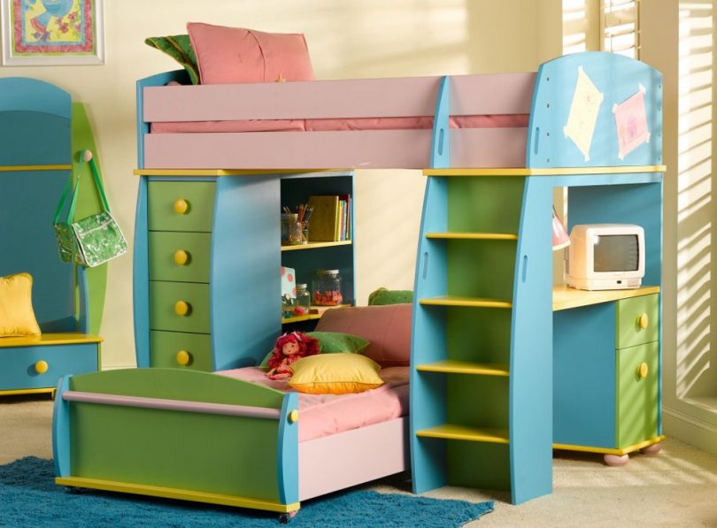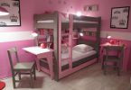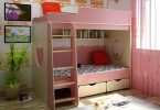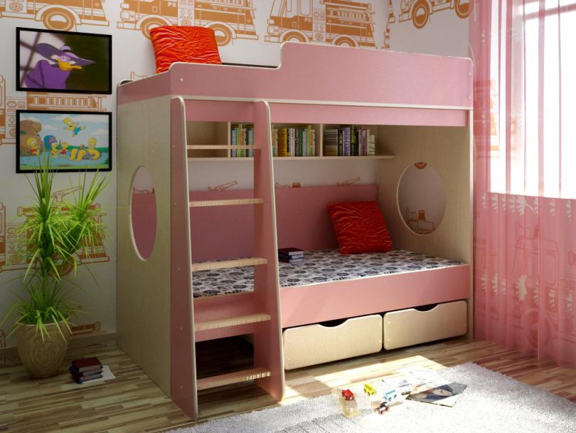 Особое внимание следует уделить двухъярусным кроватям для девочек. Такая мебель оформляется в ярких цветах, в ней обязательно должны быть полки для игрушек и книг, место для развешивания рисунков, раскладывания милых сердцу вещиц и сувениров.