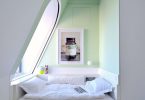 Отличным вариантом создания детской на мансардном этаже будет использование древесины, светлых пастельных тонов и большого панорамного окна.