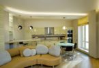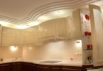 На кухне можно рассмотреть любые варианты дизайна двухуровневых потолков. Установка гипсокартонных сооружений в этой комнате требует наличие мощной вытяжки, чтобы потолок радовал ни один год хозяев своим красивым видом. Здесь лучше использовать стили с незамысловатыми формами: минимализм, хай-тек.
