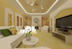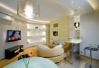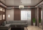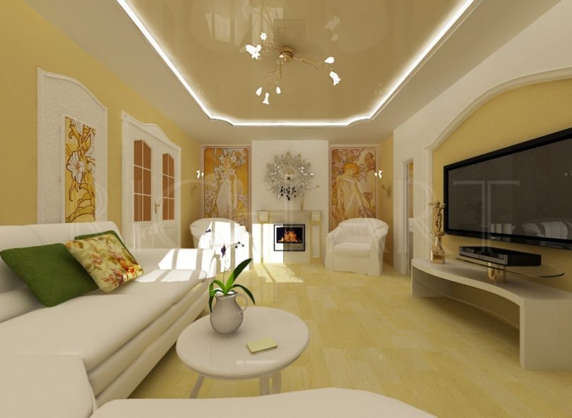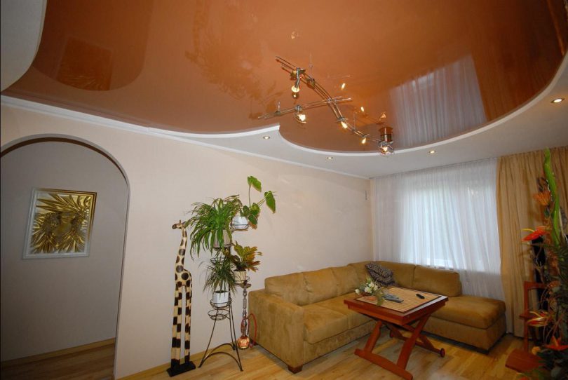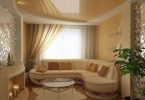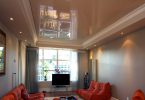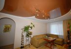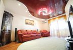 - Натяжные потолки для зала в квартире могут быть выполнены в нескольких уровнях. Стоит отметить, что если стены в помещении низкие лучше всего делать конструкцию одноуровневой. Это позволит минимизировать потери высоты. Выполнение такой конструкции отличается простотой.