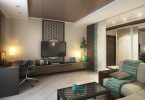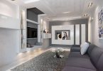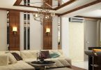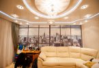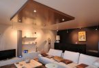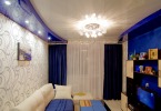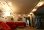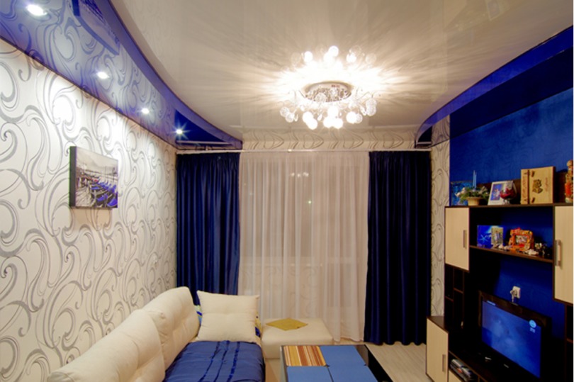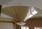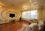 - Если стены в зале высокие, можно использовать в интерьере многоуровневую конструкцию. Фото натяжных потолков в зале такого типа можно найти в этой статье. Выполнение такой конструкции требует определенных навыков и инструментов. Многоуровневая конструкция может полностью преобразовать помещение до неузнаваемости.