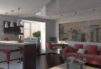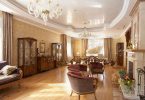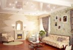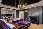- Для помещений с высокими потолками стоит отдать предпочтение многоуровневым конструкциям, они будут смотреться более оригинальными. Натяжные комбинированные потолки в зале смотрятся просто великолепно.