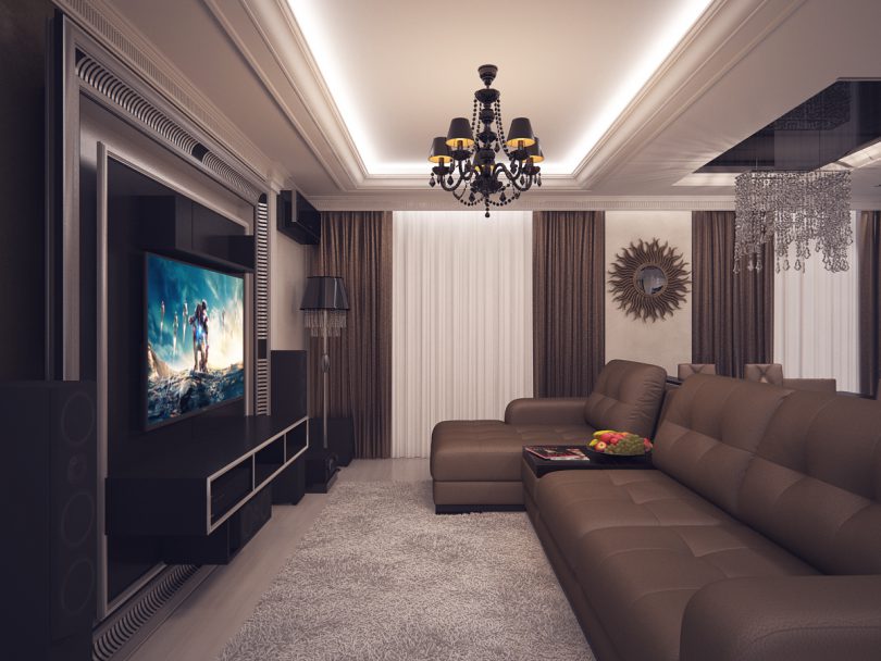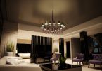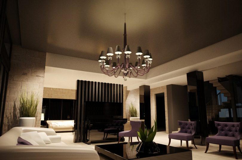 Кроме центрального освещения, в качестве которого используется люстра, можно дополнительно сделать скрытую подсветку. Она может быть устроенная в гипсокартонной конструкции либо за карнизом. Выполняя подсветку, стоит сразу сделать разные выключатели. Это дает возможность регулировать освещение в зале с натяжными потолками. При необходимости можно сделать освещение ярким, а если возникает такая потребность, свет делается более интимным.