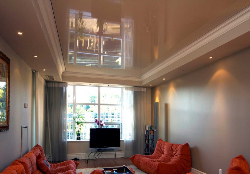 Основной характеристикой такого материала является способность отражать все предметы. Благодаря этой особенности можно визуально увеличить пространство в помещении. Полотно глянцевого типа лучше всего использовать в помещениях, которые выполняются в современном стиле. Цвет глянцевого полотна может быть самым разнообразным, при этом отлично будут смотреться на такой поверхности различные принты.
