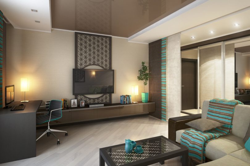 - Достаточно часто можно увидеть на фото натяжной потолок в зале с подсветкой. Такой вариант отличается оригинальностью, и превосходно будет смотреться в любой гостиной.