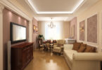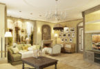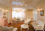 Прованс несет в себе ощущение легкости и французского уюта. Ремонт зала в квартире в стиле прованс, значит, оформить стены, потолок и пол в пастельных тонах, закупить светлую мебель и наполнить комнату фарфоровыми статуэтками, керамикой, тканью с рюшами.