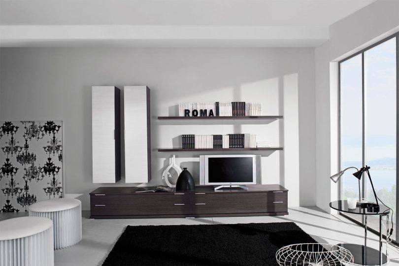 Часто данный стиль бывает оборудован стеклянными полками, придающими помещению невесомость. Используются данные модели для установки телевизоров и другой аудио и видео техники, а также для различных сувениров и красивых безделушек. Хорошо сочетаются с натяжными и разноуровневыми потолками, диодными подсветками и модной мягкой мебелью необычных современных форм.