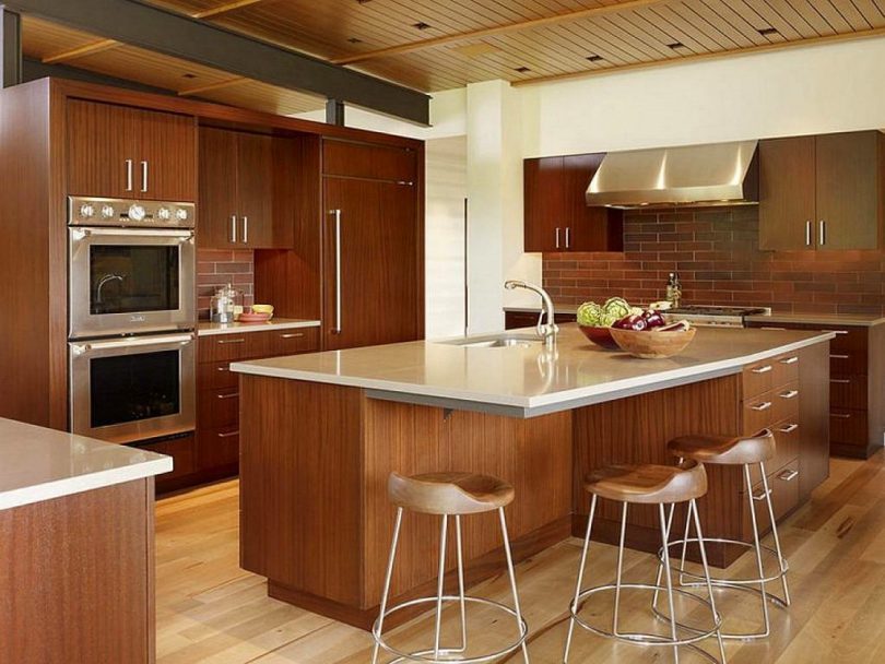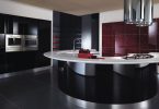 Если же размеры кухни позволяют, то очень интересным решением будет размещение рабочих поверхностей и плиты в центре помещения. Такие варианты дизайна кухни имеют плюс в том, что к плите или столу можно подойти с 2-х сторон. Это хорошо, если в процессе приготовления пищи участвует сразу несколько человек, так они не будут мешать друг другу. На фотографиях можно увидеть, что при такой компоновке здесь же можно предусмотреть и стол для приема пищи, с выдвигающейся плитой на случай прихода гостей.