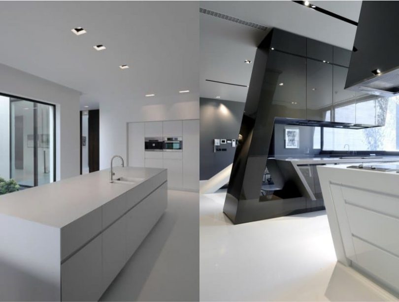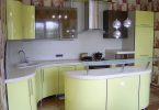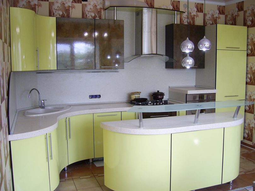 Труднее продумать геометрию для комнат со сложной формой, особенно если в них есть полукруглые выступающие наружу дома части, ниши и другие архитектурные элементы. В этом случае хозяевам стоит обратиться к профессиональным дизайнерам, которые помогут выбрать лучшие решения для поставленной задачи. Можно сместить мебель в один из углов, это будет интересным решением. Мойка устанавливается в углу, а оттуда уже отводят рабочие поверхности, плиту и шкафы для духовок, скороварок и микроволновок.