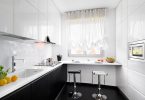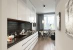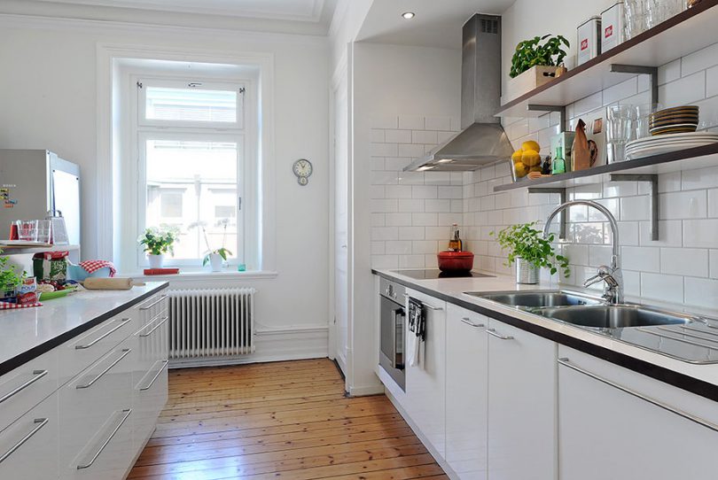 Удачным решением для размещения в узком помещении мебели станет расположение ее в две линии. Плита, мойка и рабочие поверхности устанавливаются вдоль одной стены, а мебель — напротив. Стол же ставится у окна, иногда для этого используют пространство подоконника.
