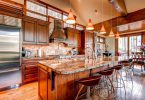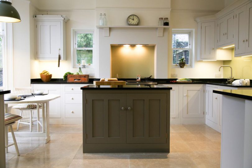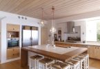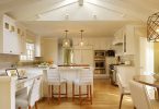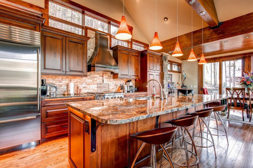 Мебель можно либо купить, либо сделать под заказ. Гармонично будет смотреться столешница из натурального или искусственного камня в комбинации с рабочей зоной из плитки. Расстановка мебели тоже играет важную роль. Чтобы расположение предметов было правильным, желательно разбить кухню частного дома на зоны. Например, можно установить барную стойку.