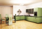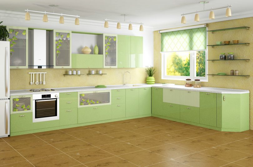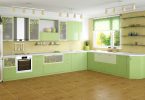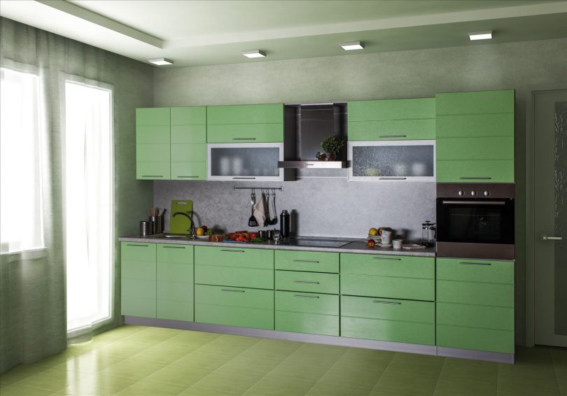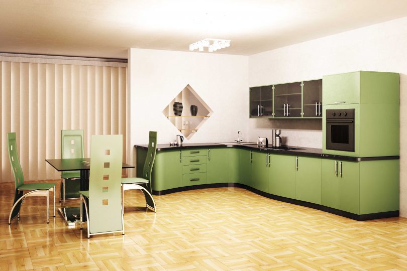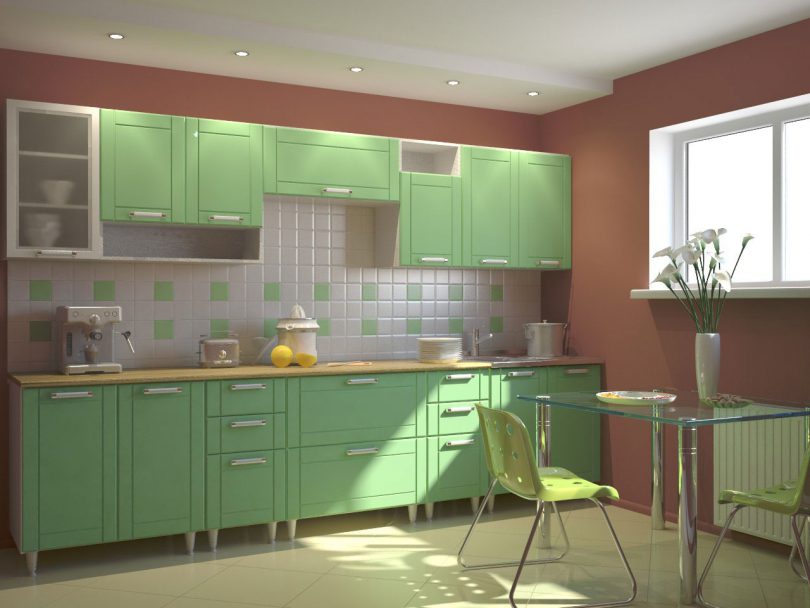 Традиционный вариант — это кухонный гарнитур зеленого цвета и подходящие варианты отделки пола, стен, потолка и предметов декора.