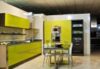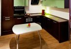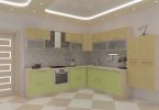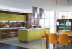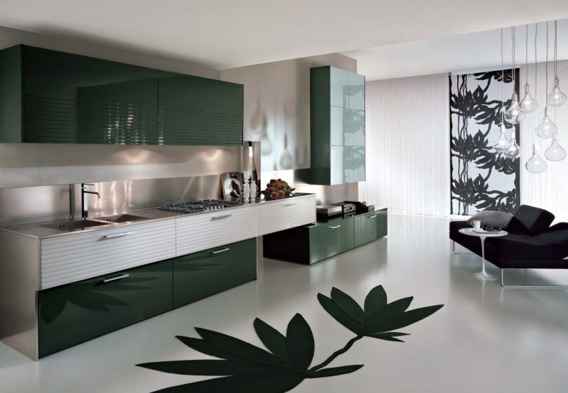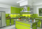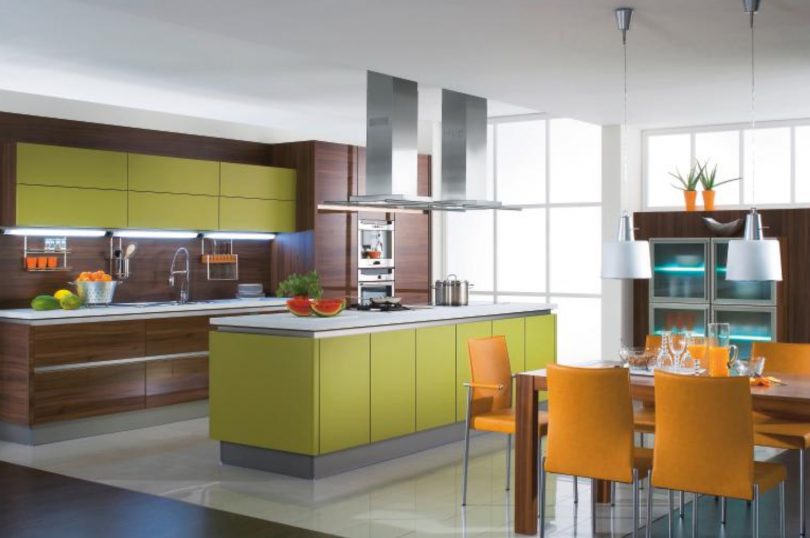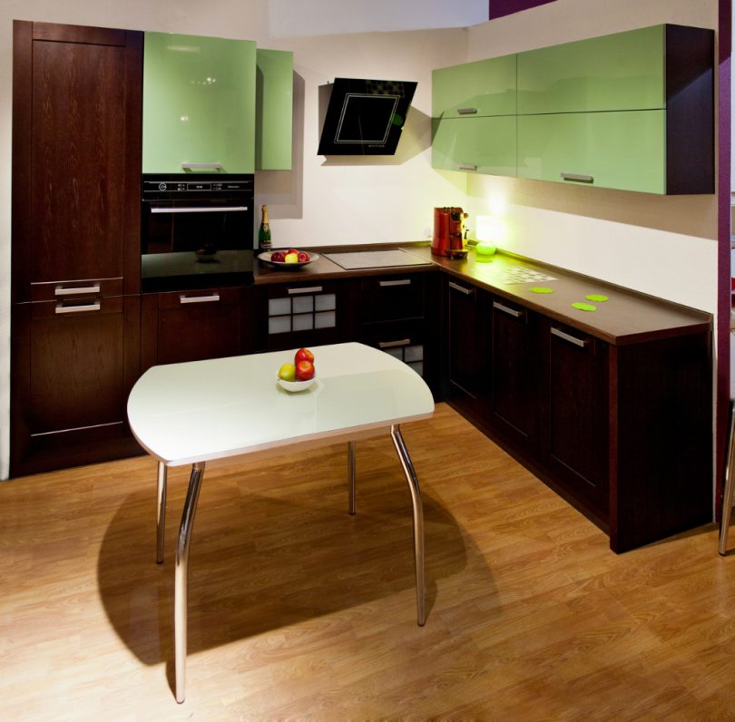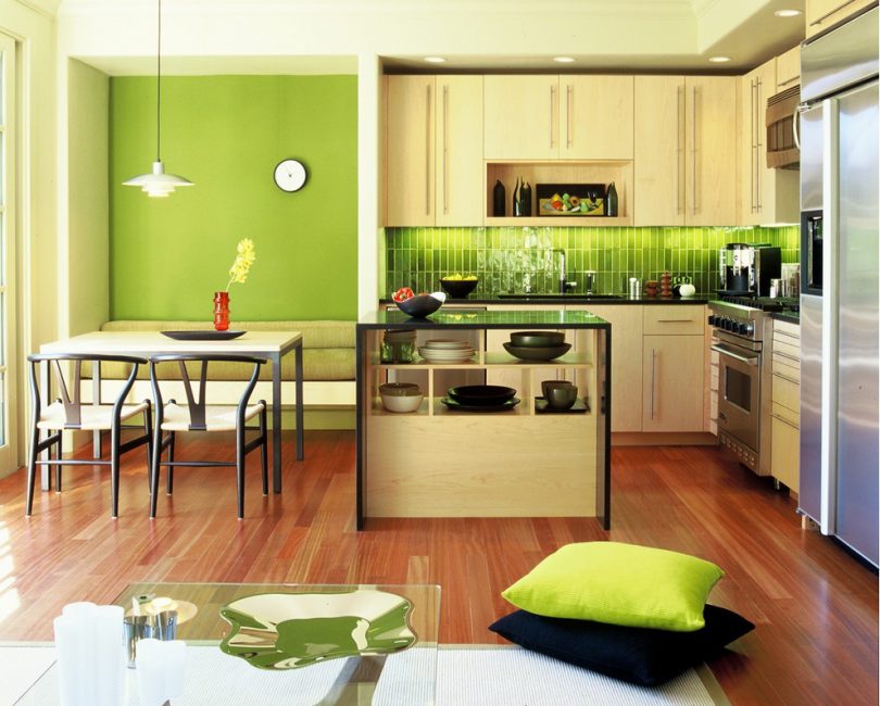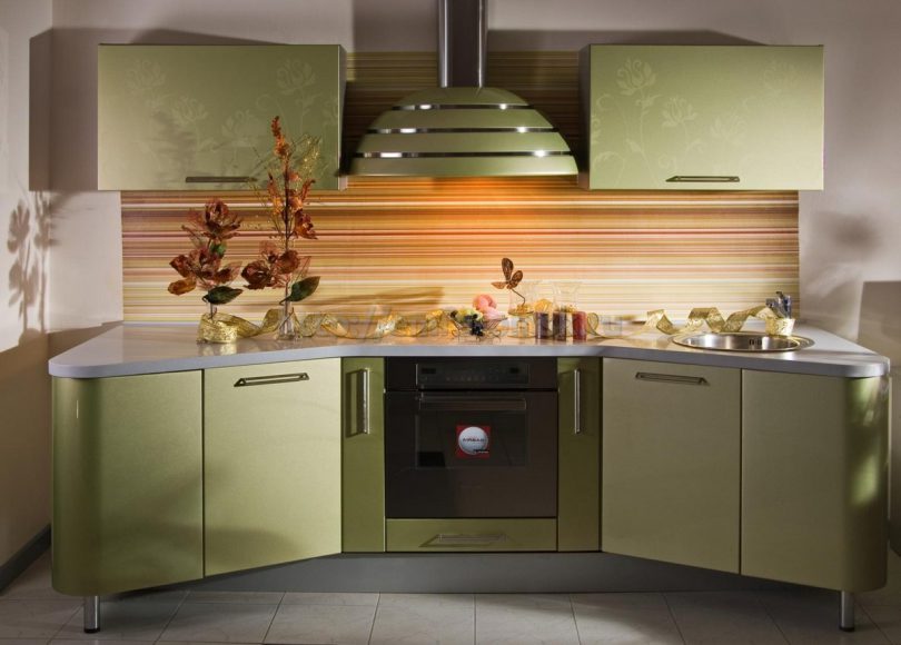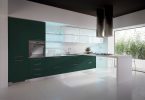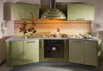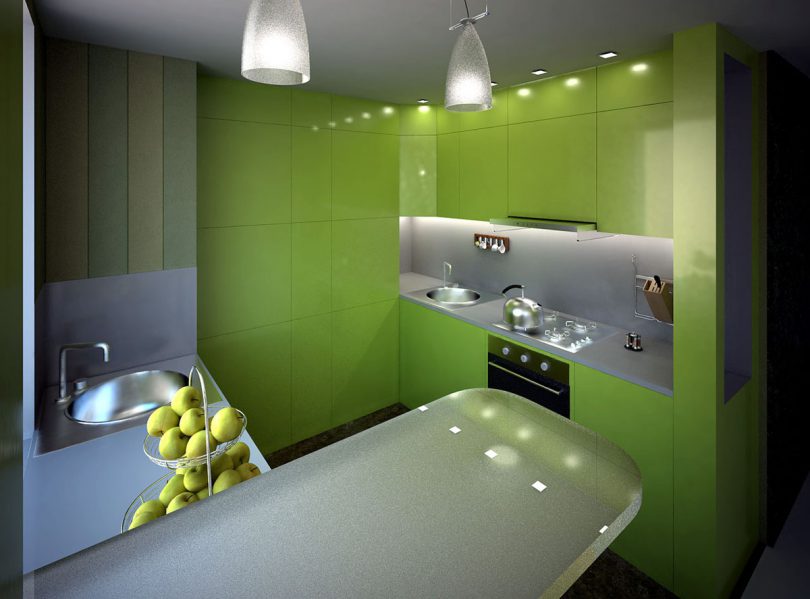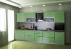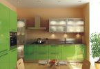 В современных стилях используется разные оттенки: от глубокого малахитового до приглушенного оливкового. Как правило, акценты в современных стилях делаются именно на цветах. Ни картины, ни декор здесь не имеют большего веса. Решающим моментом выступает эргономичность и технологичность кухни. Визитной карточкой современных стилей являются гладкие прямые фасады. В современных стилях великолепно смотрится салатовая кухня, фото которой приведено ниже.
