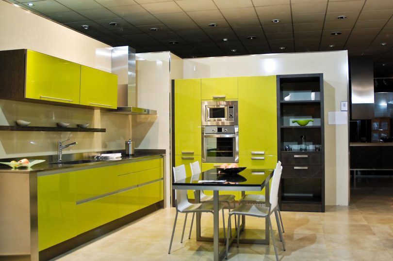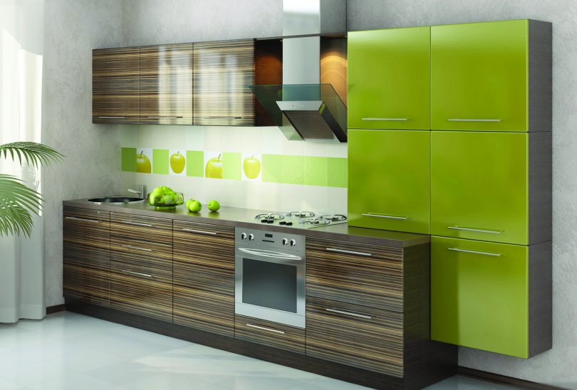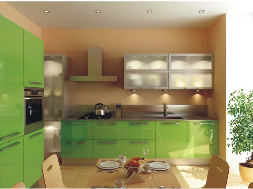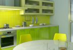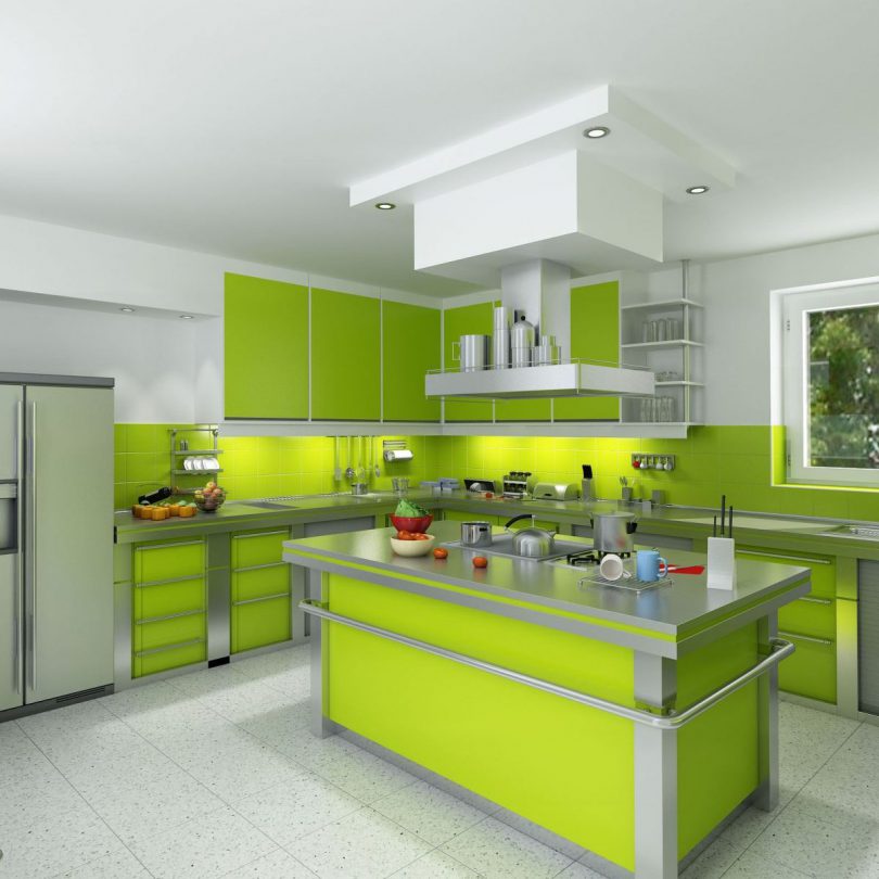 Кислотные оттенки, в том числе и салатовая кухня, будут хорошо смотреться в стиле хай-тек, где ничего не будет отвлекать от яркого основного цветового решения. Такие оттенки великолепно оттеняют гладкие фасады кухонных фурнитур.