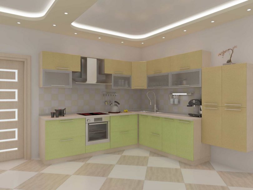 Оптимальный выбор — белый либо бежевый потолок, который будет отлично сочетаться с дизайном кухни салатового цвета, фото которой имеется в статье, и при этом не будет вызывать дисбаланс с общим цветовым решением.