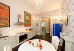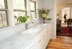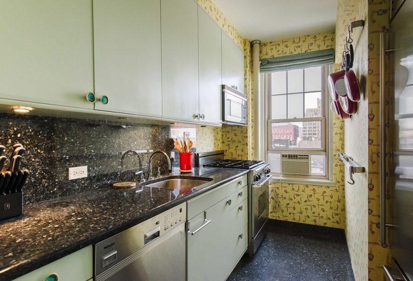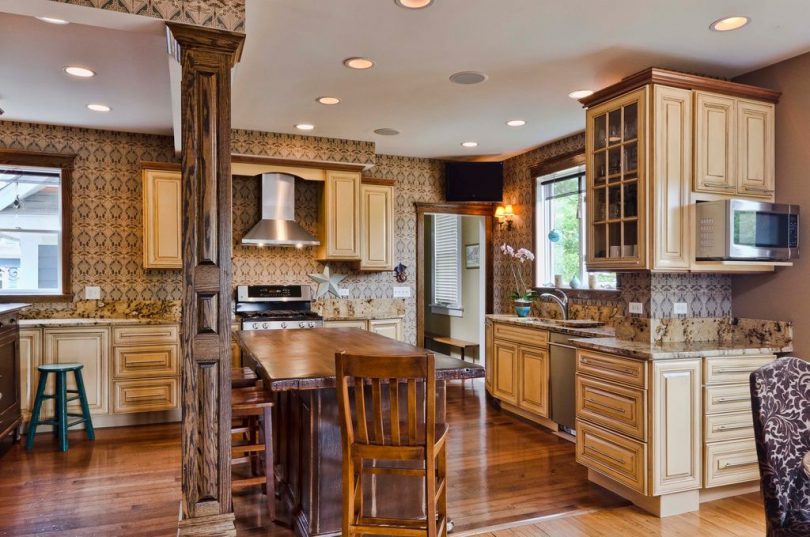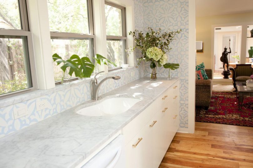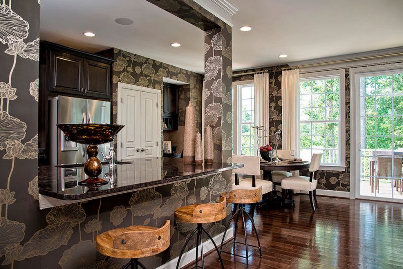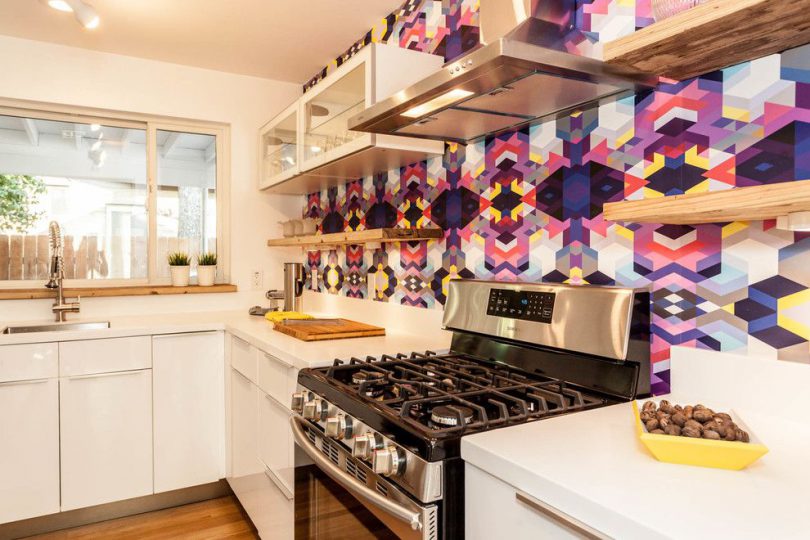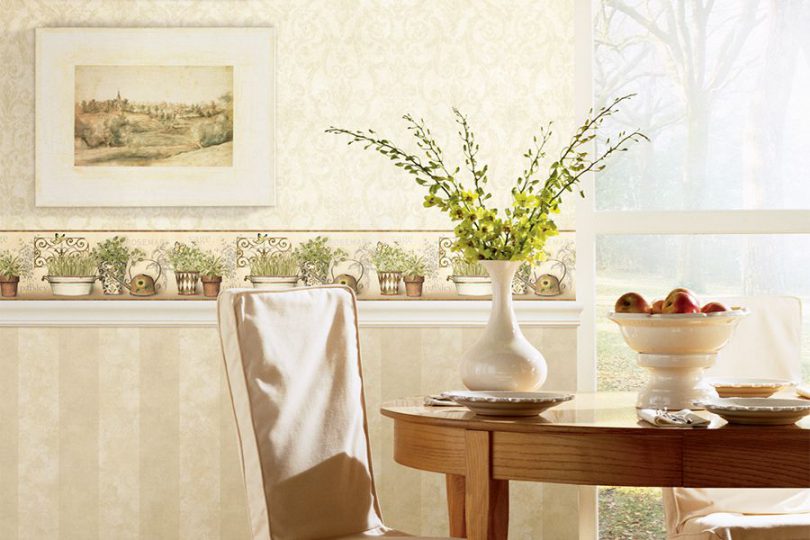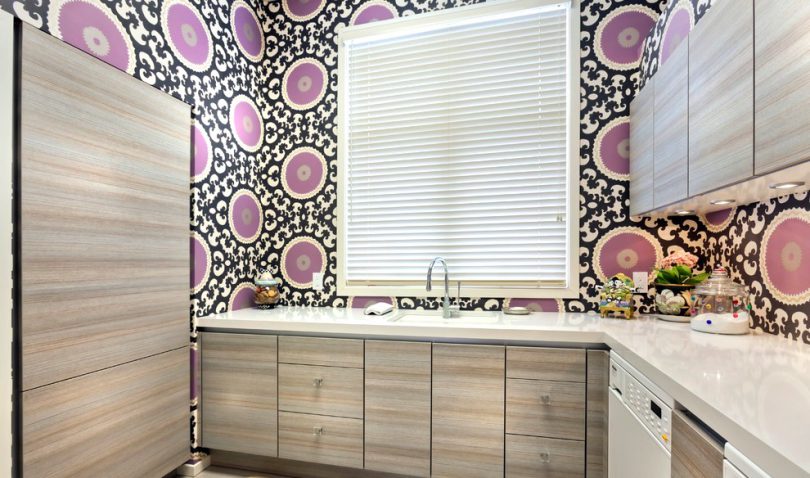 Для оклеивания кухни обычно используются обои исключительно моющиеся, то есть на основе флизелина. Отделка для стен кухни должна «дышать», поэтому флизелин идеально подходит для оклейки данного помещения. Его дышащая поверхность не боится температурных перепадов, грибка и плесени. Этот вид моющихся отделочных покрытий не способен растягиваться при соприкосновении с обойным клеем.
