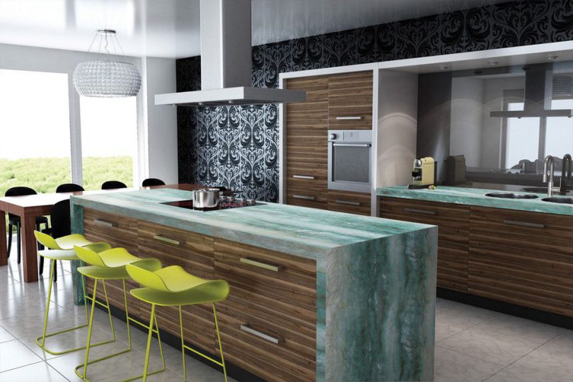 Для кухни следует всегда подбирать именно влагостойкие рулонные материалы, поскольку их с легкостью можно мыть. В состав этих материалов входит порошок из целлюлозы, включая минеральные добавки и красители. Влагостойкое покрытие, которое можно красить, сверху обрабатывается акриловым лаком.