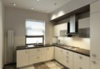 Окно обширной по габаритам кухни хорошо декорировать рулонными шторами. Они практичны и подойдут для проёмов, располагающихся рядом с рабочей зоной. На рынке представлены варианты различных размеров и расцветок. Можно подобрать ткань по вкусу.