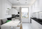 Окно на кухне, оформленное в минималистическом стиле, декорируется с помощью лёгких штор или жалюзи. Кухня должна быть максимально просторной и светлой. Каждый её элемент должен служить этой цели.