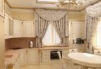 Выигрышно и красиво смотрится классика. Задача штор подчеркнуть утончённость и изысканность всего интерьера. Окно на кухне по своему дизайну должно представлять собой середину между шиком и пышностью и простотой незамысловатого оформления. Такая кухня всегда будет средоточием тепла и уюта за счёт правильно подобранных штор неярких пастельных тонов и такого же тюля.