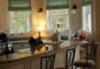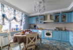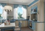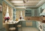 Мебель должна быть искусственно состаренная. Отличительная черта такого стиля – наличие открытых полок с выставленной посудой. Цвета стен и штор – тёплые, нежные, напоминающие солнце и море.