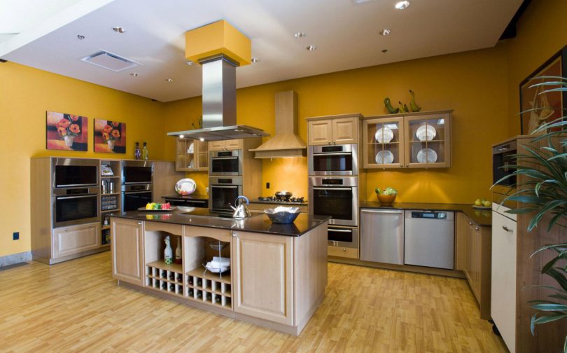 Отделка стен на кухне не должна предполагать кричащих и броских цветов или пестрых орнаментов. Лучше всего выбирать однотонный материал спокойных тонов, который можно разнообразить небольшими вставками или любым другим декором.