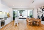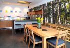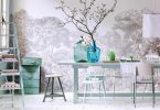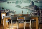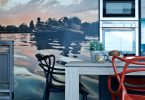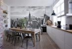 Современный интерьер кухни с фотообоями в холодных тонах помогает немного «отодвинуть» стену и визуально увеличить пространство. Для небольшой кухни-столовой лучше всего подобрать изображения, где имеется больше прохладных оттенков зеленого, синего или голубого цвета.